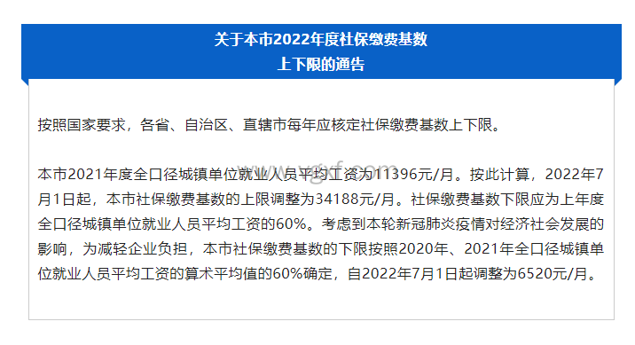 自2022年7月1日起,上海社保缴费基数上限调整为34188元/月,下限调整为6520元/月。