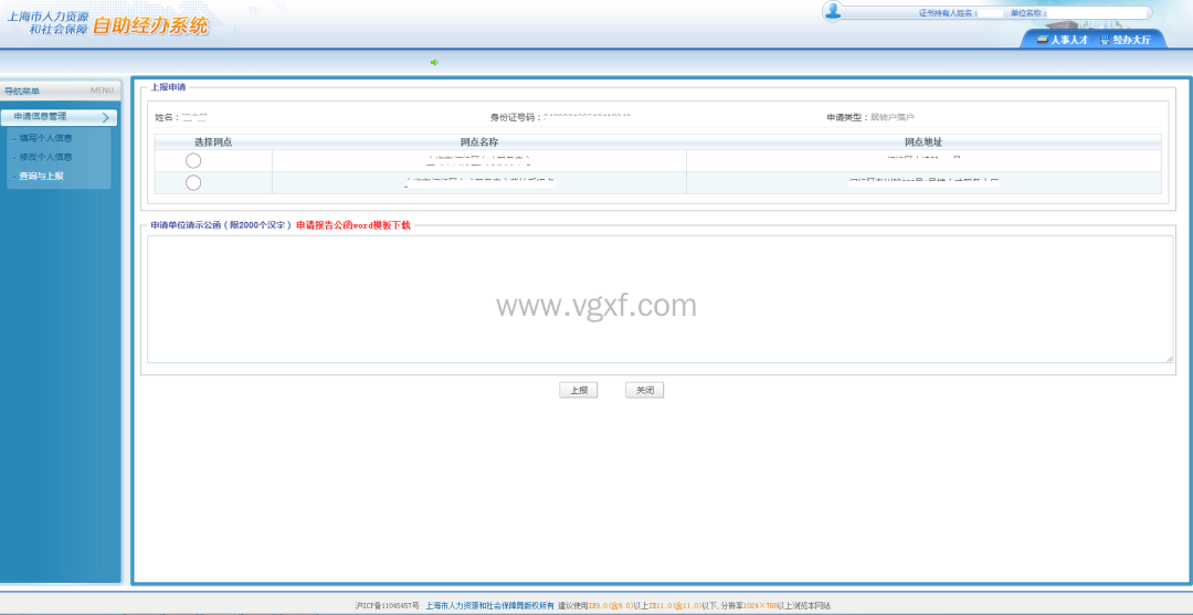 附件上传完成后点击上报,然后选择申报网点,并严格按照系统样张填写好《申请单位请示公函》,最后点击“上报”。