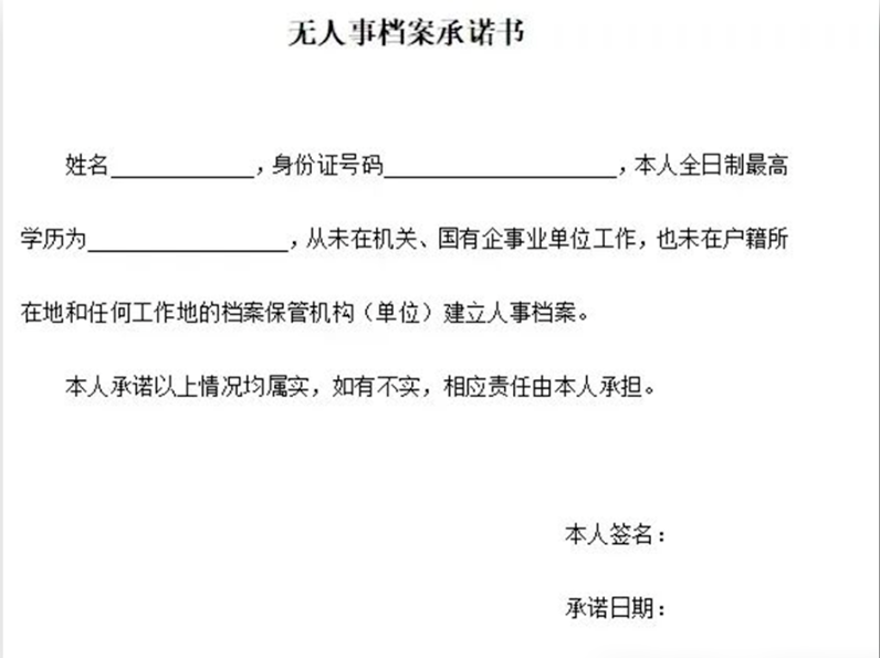 (1)申请人属于不具有中专(含职校、技校等)及以上全日制学历, 从未在机关、国有企事业单位工作,也未在户籍所在地和任何工作地的档案保管机构(单位)建立人事档案的: 可选“无人事档案”选项,并在“上传相关附件”页签署上传《无人事档案承诺书》,不需再回原户籍地人才服务中心开具无档案证明。