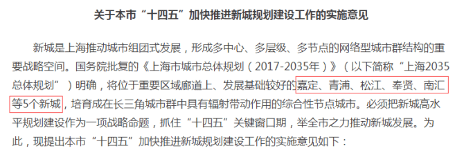 上海市政府发布的《关于本市“十四五”加快推进新城规划建设工作的实施意见》的通知文件中提出: