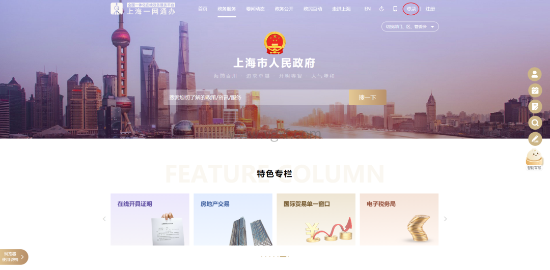 1、插入企业数字证书,进入“上海一网通办”(zwdt.sh.gov.cn)网页,点击登录。