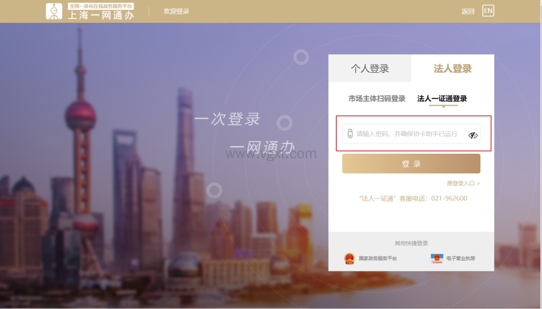 2、选择法人一证通登录,在确保协卡助手运行的情况下,输入密码并登录。