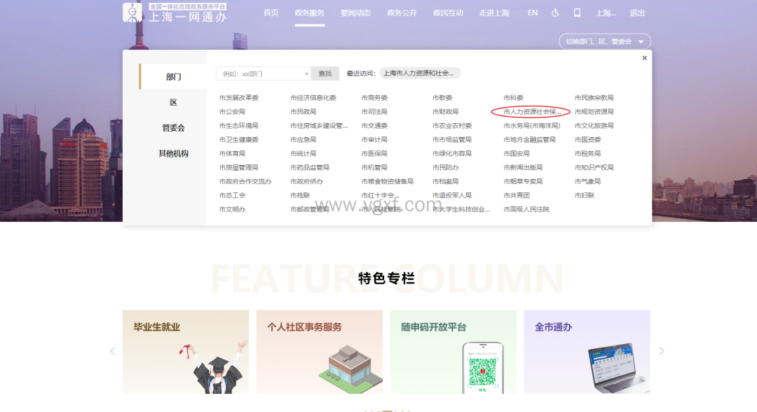 3、点击“切换部门、区、管委会”选择“上海市人力资源社会保障部门”,选择市人力资源社会保障局。