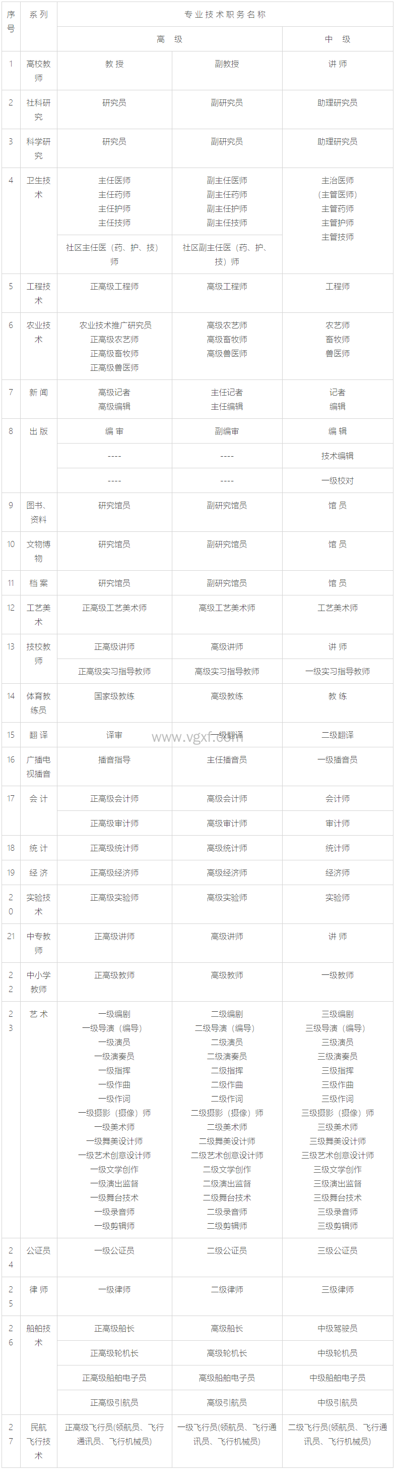 中级及以上专业技术职称(职务)可参考以下职称系列目录: