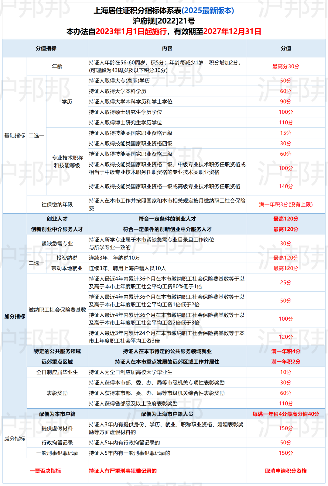 连续3年纳税10万/年或聘用10名上海户籍人员,最高加120分。 3. 减分指标与一票否决
