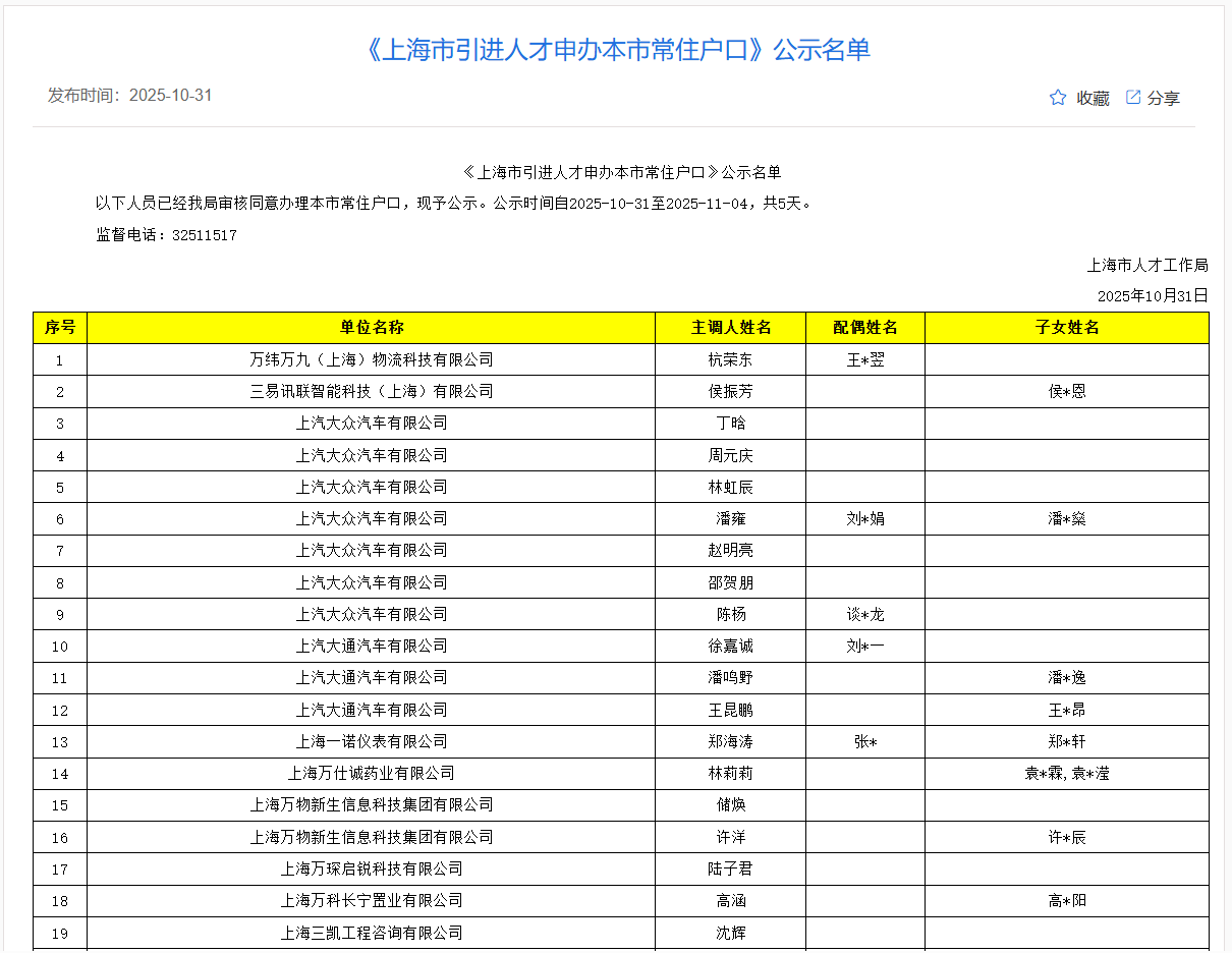 人才引进落户公示名单网址:https://www.sh-italent.com/Article/202510/202510310003.shtml