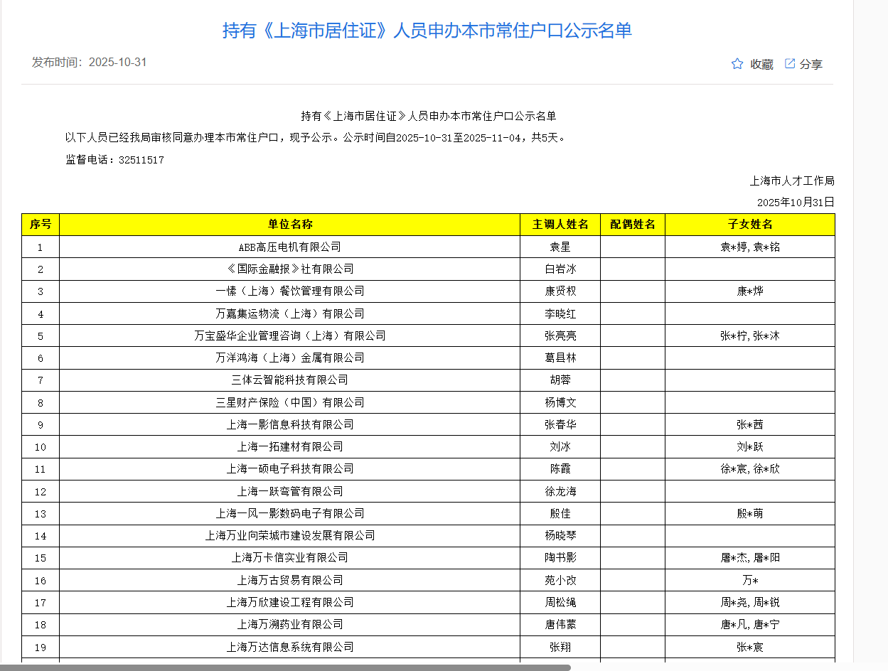 10月上海落户公示名单更新了!最新一批居转户公示名单共2941人,人才引进1451人!公示时间自2025-10-31至2025-11-4,共5天