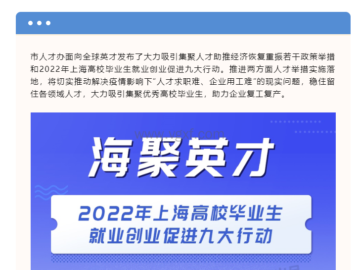 市人才办面向全球英才发布了助推经济恢复重振若干政策举措和2022年上海高校毕业生就业创业促进九大行动中出台的政策举措包括:
